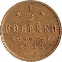 В центре указан номинал «1/2», ограниченный с обеих сторон звездочками. Под цифрой номинала слово — "КОПЕЙКИ". Ниже, расположен декоративный разделитель в виде двух изогнутых линий и небольшой окружности между ними. Под линиями год выпуска монеты "1912" и под ним обозначение монетного двора «С.П.Б.».