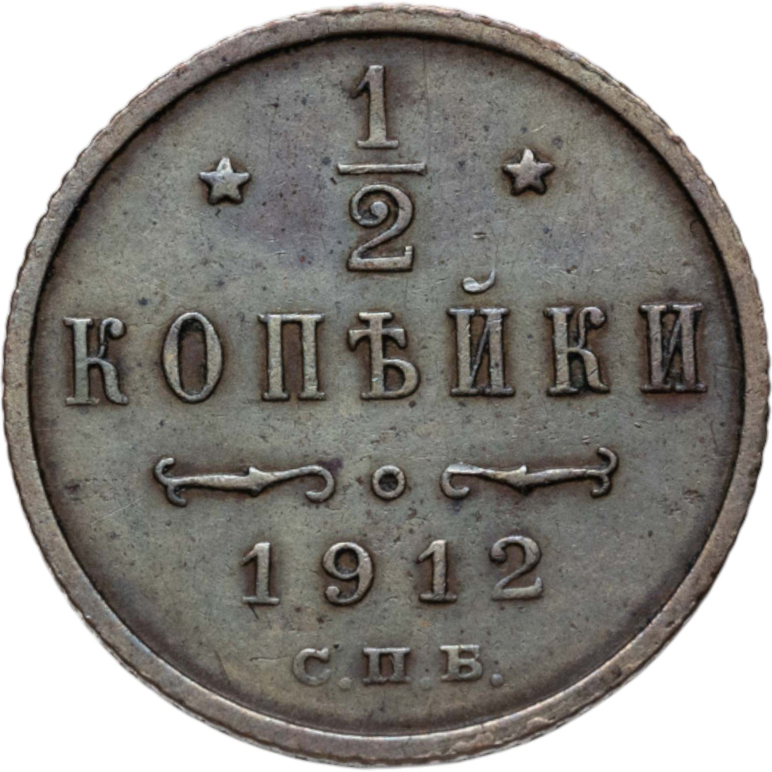 В центре указан номинал «1/2», ограниченный с обеих сторон звездочками. Под цифрой номинала слово — "КОПЕЙКИ". Ниже, расположен декоративный разделитель в виде двух изогнутых линий и небольшой окружности между ними. Под линиями год выпуска монеты "1912" и под ним обозначение монетного двора «С.П.Б.».