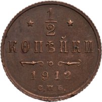 В центре указан номинал «1/2», ограниченный с обеих сторон звездочками. Под цифрой номинала слово — "КОПЕЙКИ". Ниже, расположен декоративный разделитель в виде двух изогнутых линий и небольшой окружности между ними. Под линиями год выпуска монеты "1912" и под ним обозначение монетного двора «С.П.Б.».