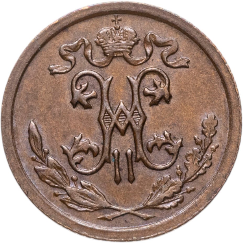 В центре вензель Николая II. Над ним Корона Российской империи с двумя развевающимися концами ленты Ордена Святого апостола Андрея Первозванного. Под вензелем, вдоль канта, две скрещенные ветви: слева лавровая, справа дубовая.