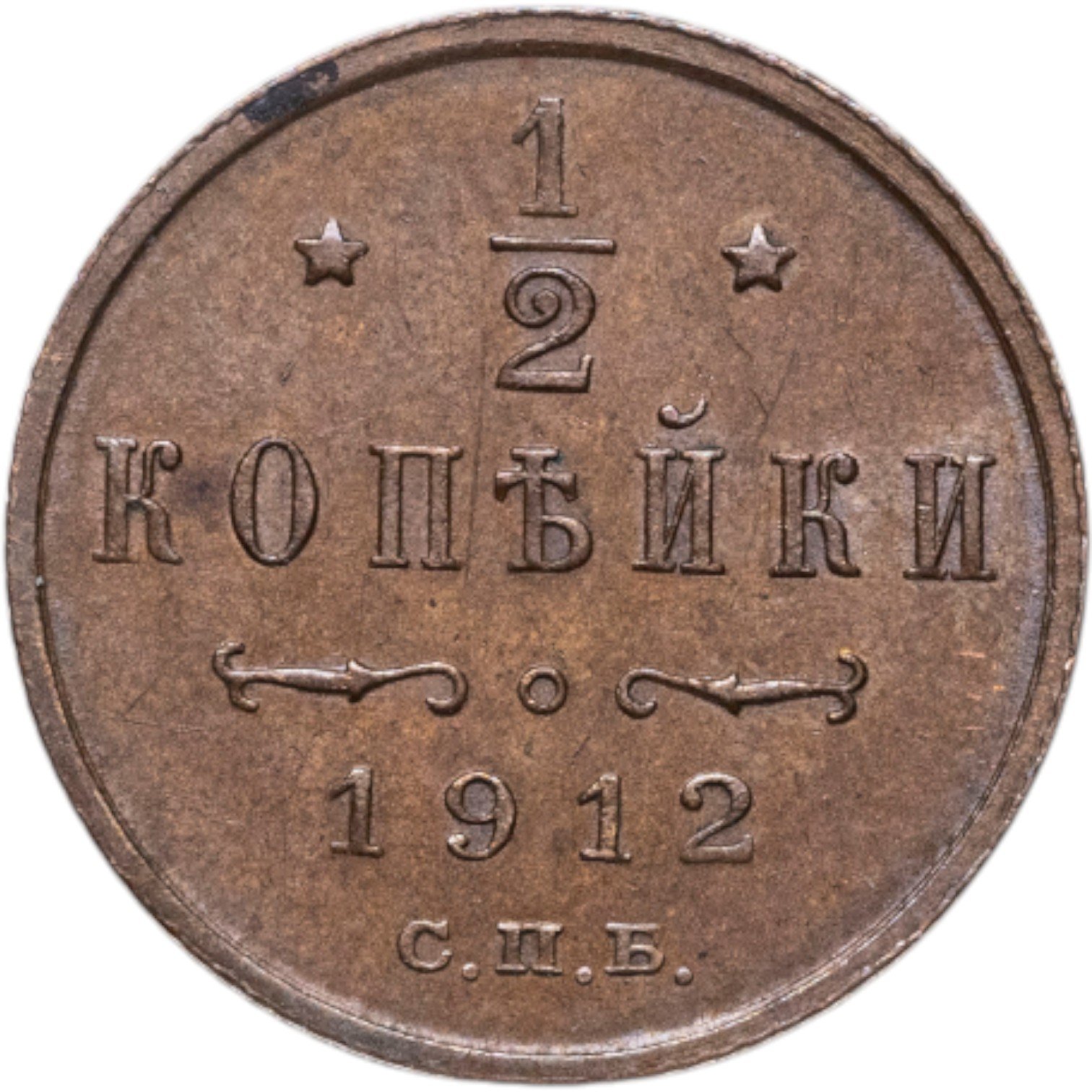 В центре указан номинал «1/2», ограниченный с обеих сторон звездочками. Под цифрой номинала слово — "КОПЕЙКИ". Ниже, расположен декоративный разделитель в виде двух изогнутых линий и небольшой окружности между ними. Под линиями год выпуска монеты "1912" и под ним обозначение монетного двора «С.П.Б.».