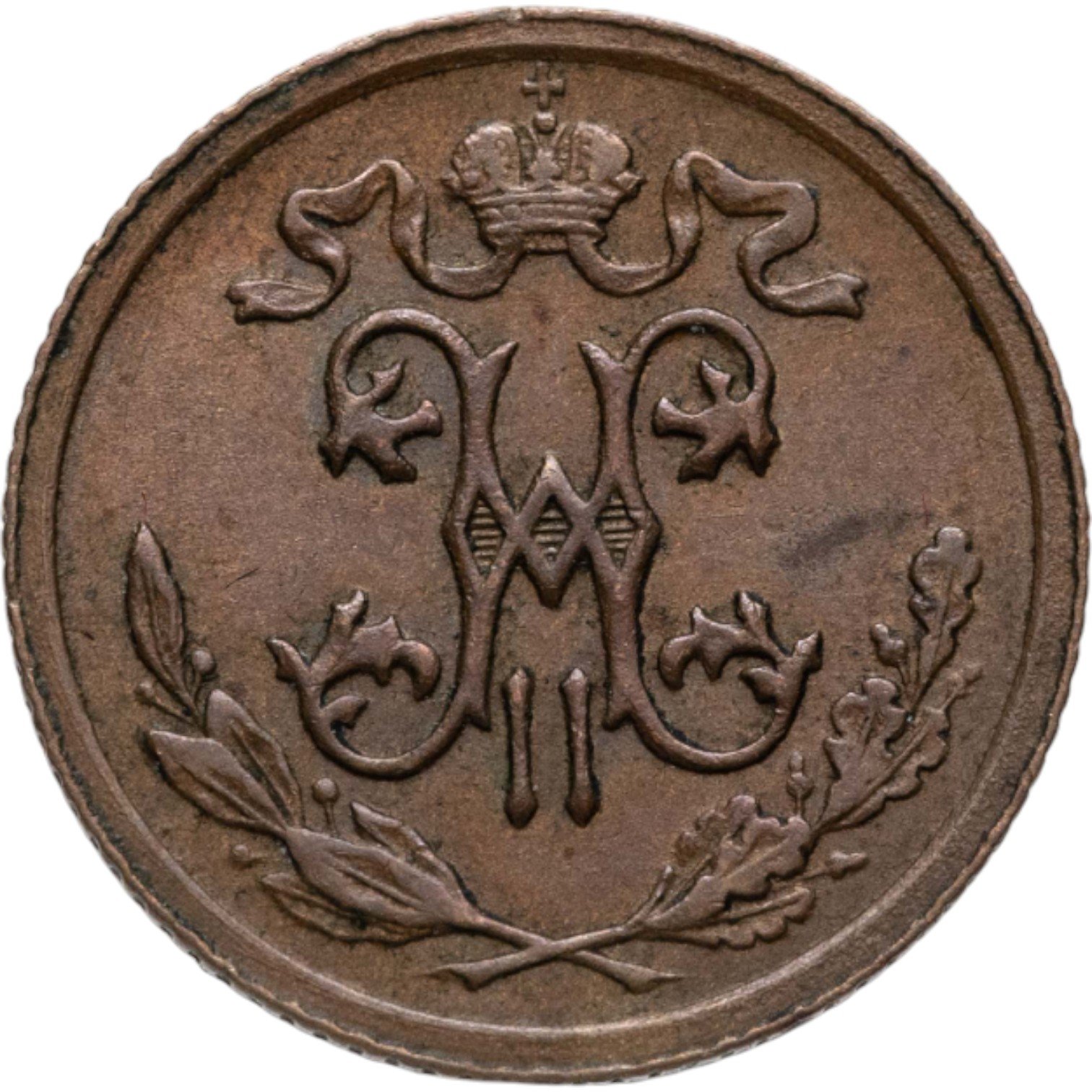 В центре вензель Николая II. Над ним Корона Российской империи с двумя развевающимися концами ленты Ордена Святого апостола Андрея Первозванного. Под вензелем, вдоль канта, две скрещенные ветви: слева лавровая, справа дубовая.
