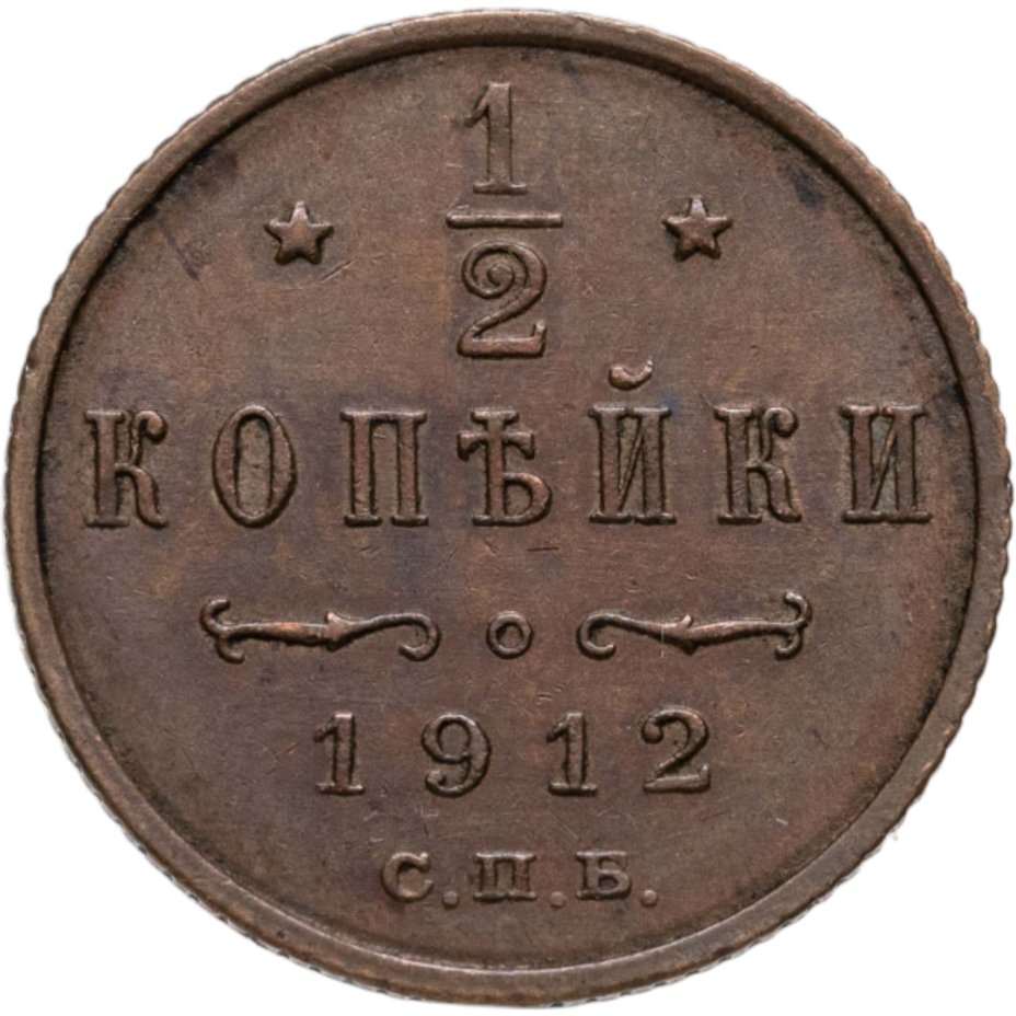 В центре указан номинал «1/2», ограниченный с обеих сторон звездочками. Под цифрой номинала слово — "КОПЕЙКИ". Ниже, расположен декоративный разделитель в виде двух изогнутых линий и небольшой окружности между ними. Под линиями год выпуска монеты "1912" и под ним обозначение монетного двора «С.П.Б.».
