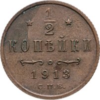 В центре указан номинал «1/2», ограниченный с обеих сторон звездочками. Под цифрой номинала слово — "КОПЕЙКИ". Ниже, расположен декоративный разделитель в виде двух изогнутых линий и небольшой окружности между ними. Под линиями год выпуска монеты "1913" и под ним обозначение монетного двора «С.П.Б.».