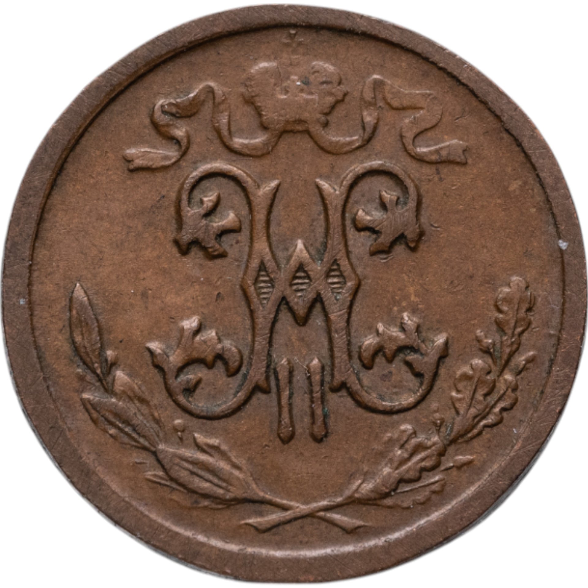 В центре вензель Николая II. Над ним Корона Российской империи с двумя развевающимися концами ленты Ордена Святого апостола Андрея Первозванного. Под вензелем, вдоль канта, две скрещенные ветви: слева лавровая, справа дубовая.