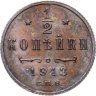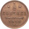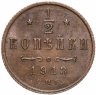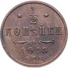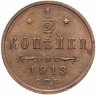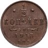 В центре указан номинал «1/2», ограниченный с обеих сторон звездочками. Под цифрой номинала слово — "КОПЕЙКИ". Ниже, расположен декоративный разделитель в виде двух изогнутых линий и небольшой окружности между ними. Под линиями год выпуска монеты "1913" и под ним обозначение монетного двора «С.П.Б.».