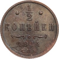 В центре указан номинал «1/2», ограниченный с обеих сторон звездочками. Под цифрой номинала слово — "КОПЕЙКИ". Ниже, расположен декоративный разделитель в виде двух изогнутых линий и небольшой окружности между ними. Под линиями год выпуска монеты "1914" и под ним обозначение монетного двора «С.П.Б.».