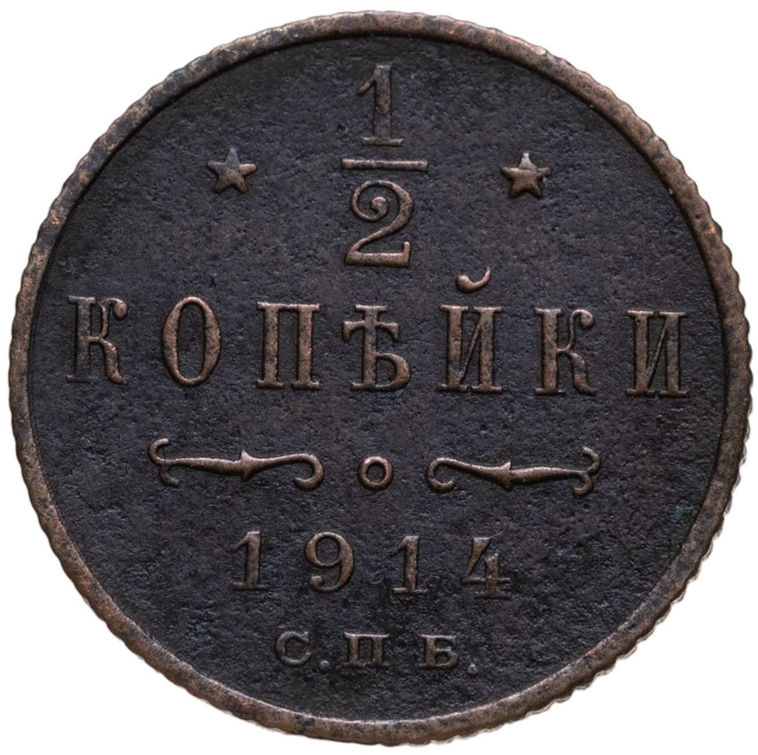 В центре указан номинал «1/2», ограниченный с обеих сторон звездочками. Под цифрой номинала слово — "КОПЕЙКИ". Ниже, расположен декоративный разделитель в виде двух изогнутых линий и небольшой окружности между ними. Под линиями год выпуска монеты "1914" и под ним обозначение монетного двора «С.П.Б.».