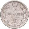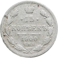 В центре указан номинал «15», ограниченный с обеих сторон звездочками. Над цифрой – Корона Российской империи. Под цифрой номинала — слово "КОПЕЕК". Ниже, расположен декоративный разделитель в виде двух разнонаправленных фигурных линий и стилизованным из точек крестом между ними. Под разделителем — дата выпуска монеты «1900». Под цифрой даты — обозначение монетного двора «С.П.Б.». Вдоль канта, не доходя до короны, изображен венок из лавровой и дубовой ветви, которые в нижней части перевязаны лентой на узел бантом. По окружности канта имеются рельефные элементы, выполненные в виде зубцов.