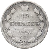 В центре указан номинал «15», ограниченный с обеих сторон звездочками. Над цифрой – Корона Российской империи. Под цифрой номинала — слово "КОПЕЕК". Ниже, расположен декоративный разделитель в виде двух разнонаправленных фигурных линий и стилизованным из точек крестом между ними. Под разделителем — дата выпуска монеты «1900». Под цифрой даты — обозначение монетного двора «С.П.Б.». Вдоль канта, не доходя до короны, изображен венок из лавровой и дубовой ветви, которые в нижней части перевязаны лентой на узел бантом. По окружности канта имеются рельефные элементы, выполненные в виде зубцов.