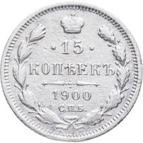 В центре указан номинал «15», ограниченный с обеих сторон звездочками. Над цифрой – Корона Российской империи. Под цифрой номинала — слово "КОПЕЕК". Ниже, расположен декоративный разделитель в виде двух разнонаправленных фигурных линий и стилизованным из точек крестом между ними. Под разделителем — дата выпуска монеты «1900». Под цифрой даты — обозначение монетного двора «С.П.Б.». Вдоль канта, не доходя до короны, изображен венок из лавровой и дубовой ветви, которые в нижней части перевязаны лентой на узел бантом. По окружности канта имеются рельефные элементы, выполненные в виде зубцов.