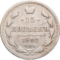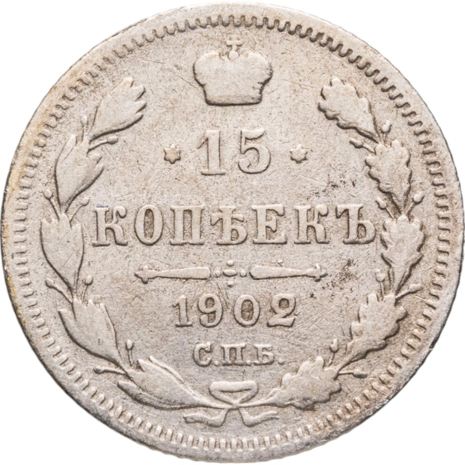 В центре указан номинал «15», ограниченный с обеих сторон звездочками. Над цифрой – Корона Российской империи. Под цифрой номинала — слово "КОПЕЕК". Ниже, расположен декоративный разделитель в виде двух разнонаправленных фигурных линий и стилизованным из точек крестом между ними. Под разделителем — дата выпуска монеты «1902». Под цифрой даты — обозначение монетного двора «С.П.Б.». Вдоль канта, не доходя до короны, изображен венок из лавровой и дубовой ветви, которые в нижней части перевязаны лентой на узел бантом. По окружности канта имеются рельефные элементы, выполненные в виде зубцов.