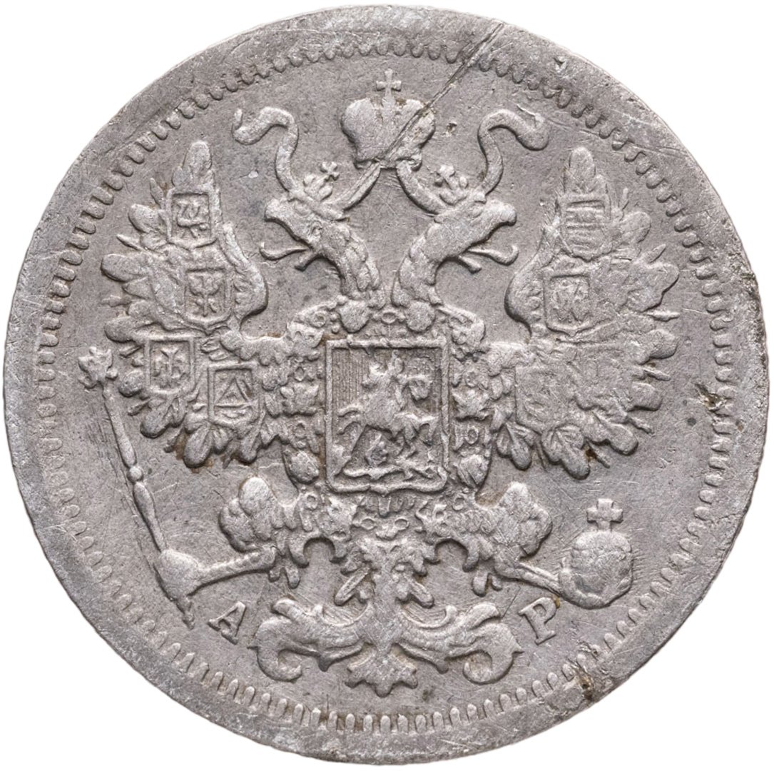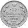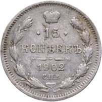 В центре указан номинал «15», ограниченный с обеих сторон звездочками. Над цифрой – Корона Российской империи. Под цифрой номинала — слово "КОПЕЕК". Ниже, расположен декоративный разделитель в виде двух разнонаправленных фигурных линий и стилизованным из точек крестом между ними. Под разделителем — дата выпуска монеты «1902». Под цифрой даты — обозначение монетного двора «С.П.Б.». Вдоль канта, не доходя до короны, изображен венок из лавровой и дубовой ветви, которые в нижней части перевязаны лентой на узел бантом. По окружности канта имеются рельефные элементы, выполненные в виде зубцов.