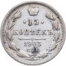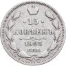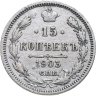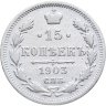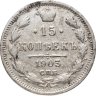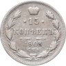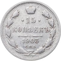 В центре указан номинал «15», ограниченный с обеих сторон звездочками. Над цифрой – Корона Российской империи. Под цифрой номинала — слово "КОПЕЕК". Ниже, расположен декоративный разделитель в виде двух разнонаправленных фигурных линий и стилизованным из точек крестом между ними. Под разделителем — дата выпуска монеты «1903». Под цифрой даты — обозначение монетного двора «С.П.Б.». Вдоль канта, не доходя до короны, изображен венок из лавровой и дубовой ветви, которые в нижней части перевязаны лентой на узел бантом. По окружности канта имеются рельефные элементы, выполненные в виде зубцов.