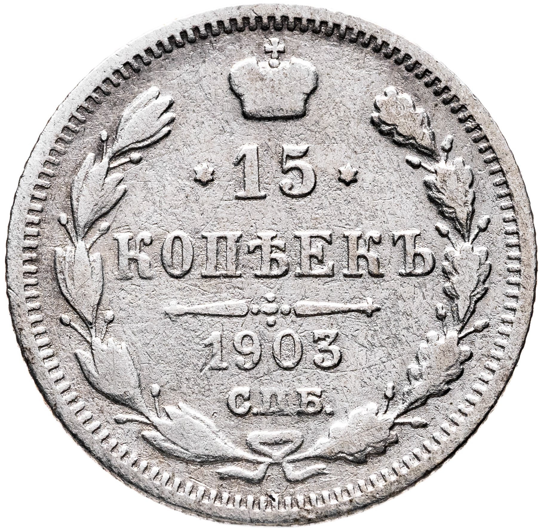В центре указан номинал «15», ограниченный с обеих сторон звездочками. Над цифрой – Корона Российской империи. Под цифрой номинала — слово "КОПЕЕК". Ниже, расположен декоративный разделитель в виде двух разнонаправленных фигурных линий и стилизованным из точек крестом между ними. Под разделителем — дата выпуска монеты «1903». Под цифрой даты — обозначение монетного двора «С.П.Б.». Вдоль канта, не доходя до короны, изображен венок из лавровой и дубовой ветви, которые в нижней части перевязаны лентой на узел бантом. По окружности канта имеются рельефные элементы, выполненные в виде зубцов.