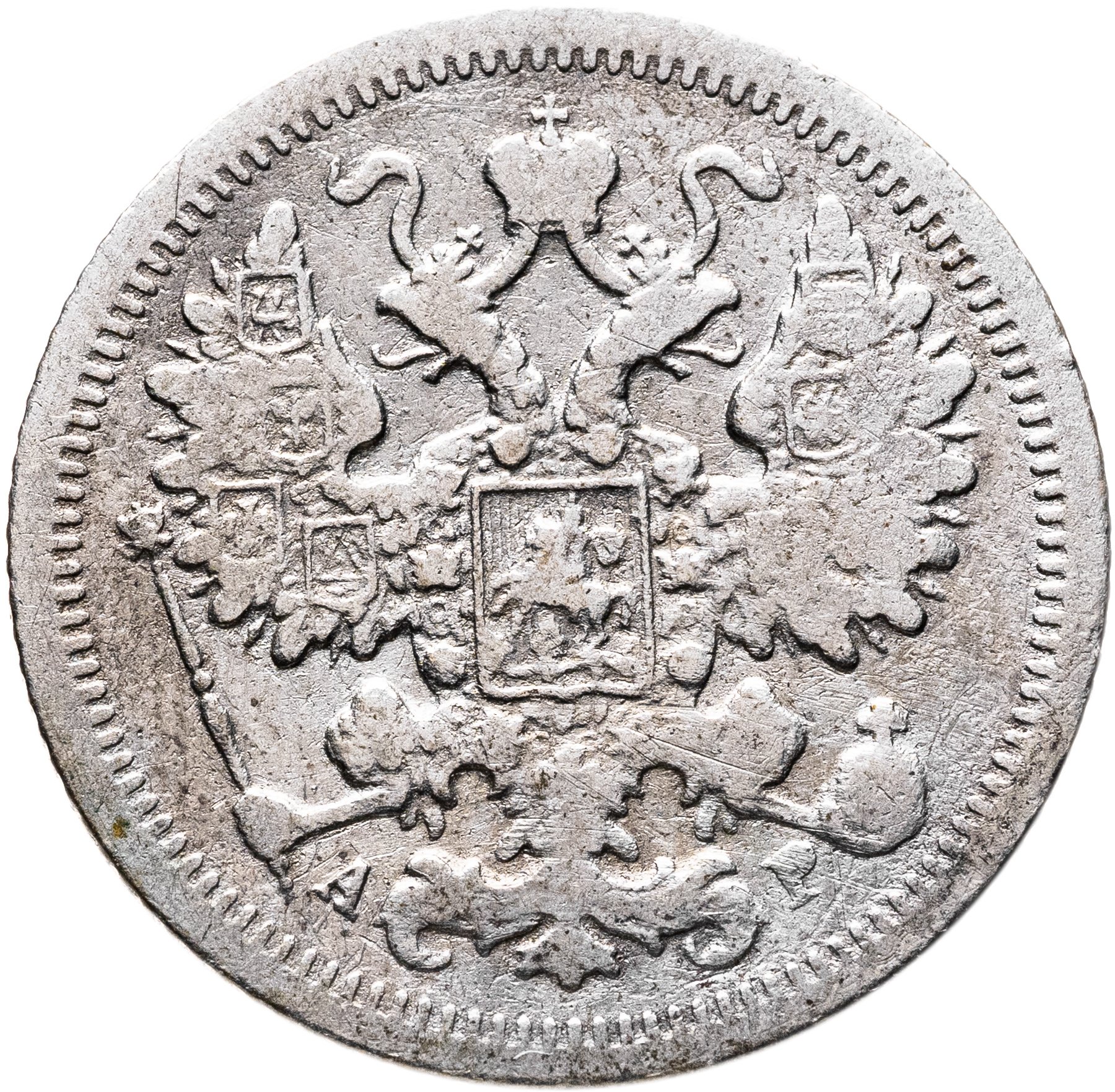 В центре изображен Малый Государственный Герб Российской империи - двуглавый орёл, головы которого увенчаны двумя коронами, третья, большая корона над ними. Все они соединены орденской лентой ордена Св. Апостола Андрея Первозванного. На груди орла расположен Московский герб, в щите изображен Георгий Победоносец с копьем поражающий дракона. Вокруг щита цепь ордена Св. Апостола Андрея Первозванного. На крыльях изображены гербы: Царства Казанского, Польского, Херсонеса Таврического, Астраханского, Сибирского, Грузинского и герб соединенных княжеств Киевского, Новгородского и Владимирского — по 4 на каждое крыло. В правой лапе орла – скипетр, в левой – держава. Под правой лапой – буква «А», под левой – буква «Р». Инициалы минцмейстера Александра Редько. По окружности канта имеются рельефные элементы, выполненные в виде зубцов.