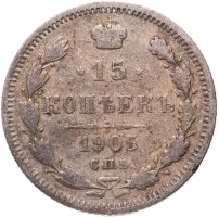 В центре указан номинал «15», ограниченный с обеих сторон звездочками. Над цифрой – Корона Российской империи. Под цифрой номинала — слово "КОПЕЕК". Ниже, расположен декоративный разделитель в виде двух разнонаправленных фигурных линий и стилизованным из точек крестом между ними. Под разделителем — дата выпуска монеты «1905». Под цифрой даты — обозначение монетного двора «С.П.Б.». Вдоль канта, не доходя до короны, изображен венок из лавровой и дубовой ветви, которые в нижней части перевязаны лентой на узел бантом. По окружности канта имеются рельефные элементы, выполненные в виде зубцов.