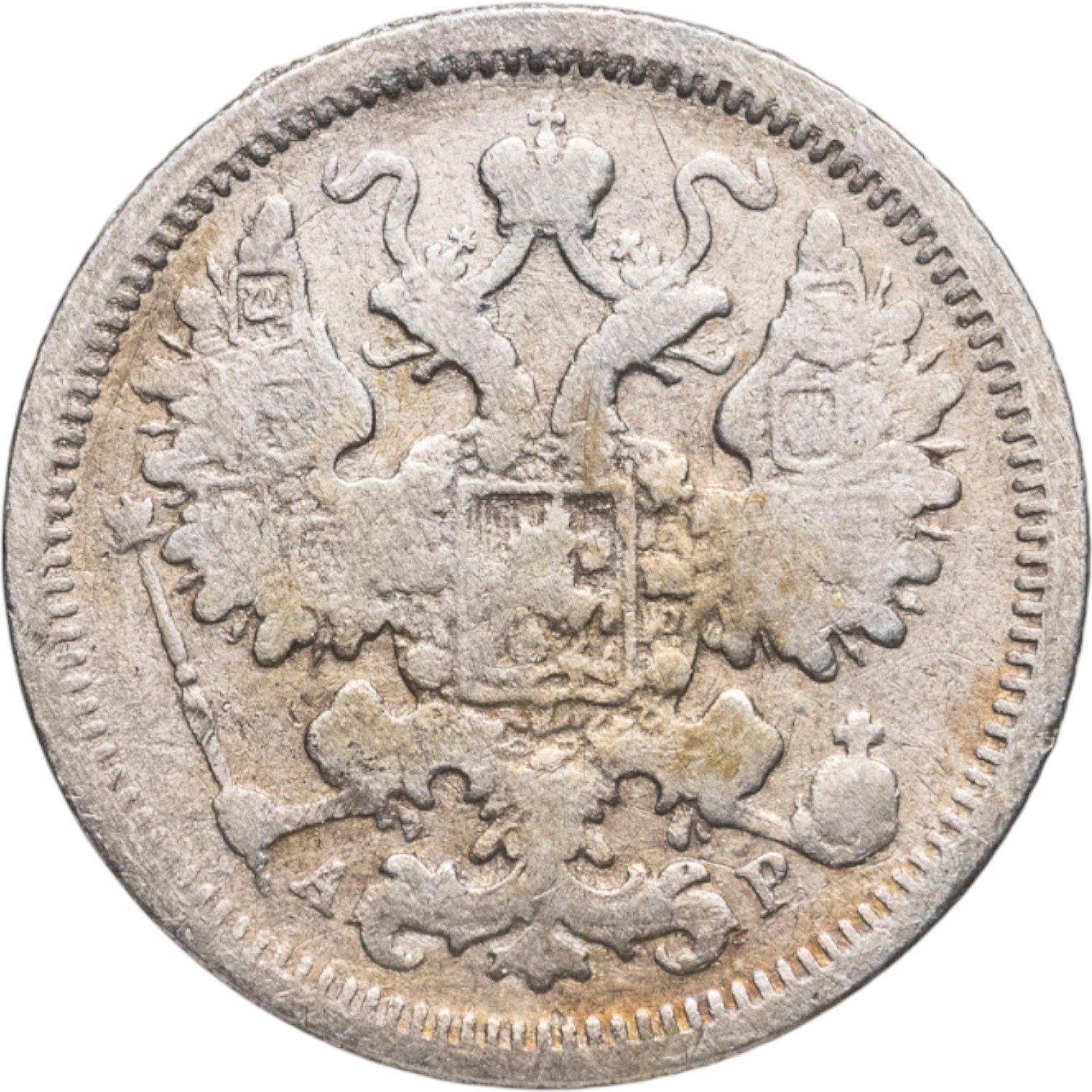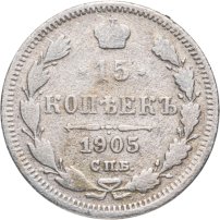 В центре указан номинал «15», ограниченный с обеих сторон звездочками. Над цифрой – Корона Российской империи. Под цифрой номинала — слово "КОПЕЕК". Ниже, расположен декоративный разделитель в виде двух разнонаправленных фигурных линий и стилизованным из точек крестом между ними. Под разделителем — дата выпуска монеты «1905». Под цифрой даты — обозначение монетного двора «С.П.Б.». Вдоль канта, не доходя до короны, изображен венок из лавровой и дубовой ветви, которые в нижней части перевязаны лентой на узел бантом. По окружности канта имеются рельефные элементы, выполненные в виде зубцов.