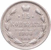 В центре указан номинал «15», ограниченный с обеих сторон звездочками. Над цифрой – Корона Российской империи. Под цифрой номинала — слово "КОПЕЕК". Ниже, расположен декоративный разделитель в виде двух разнонаправленных фигурных линий и стилизованным из точек крестом между ними. Под разделителем — дата выпуска монеты «1906». Под цифрой даты — обозначение монетного двора «С.П.Б.». Вдоль канта, не доходя до короны, изображен венок из лавровой и дубовой ветви, которые в нижней части перевязаны лентой на узел бантом. По окружности канта имеются рельефные элементы, выполненные в виде зубцов.