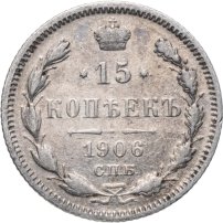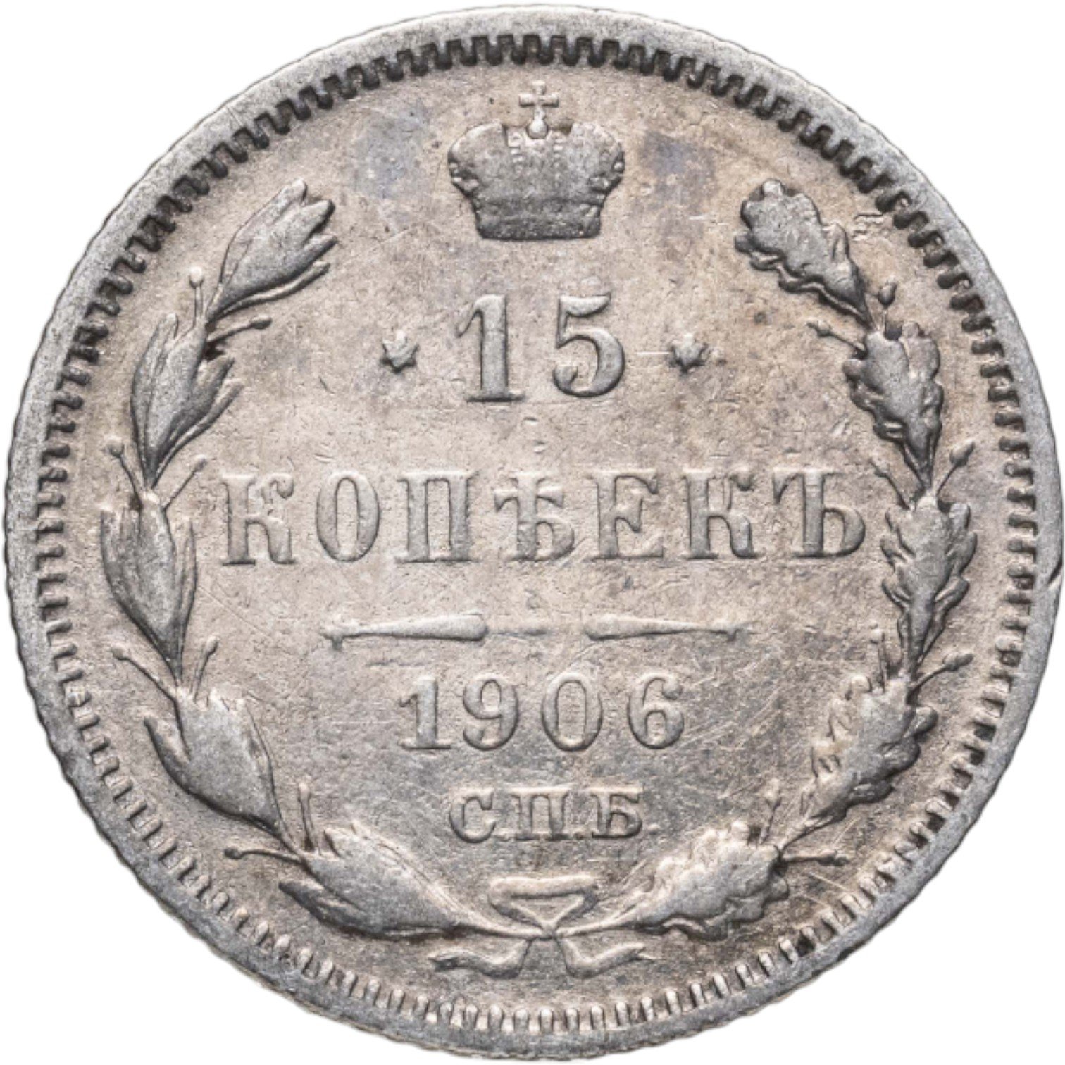 В центре указан номинал «15», ограниченный с обеих сторон звездочками. Над цифрой – Корона Российской империи. Под цифрой номинала — слово "КОПЕЕК". Ниже, расположен декоративный разделитель в виде двух разнонаправленных фигурных линий и стилизованным из точек крестом между ними. Под разделителем — дата выпуска монеты «1906». Под цифрой даты — обозначение монетного двора «С.П.Б.». Вдоль канта, не доходя до короны, изображен венок из лавровой и дубовой ветви, которые в нижней части перевязаны лентой на узел бантом. По окружности канта имеются рельефные элементы, выполненные в виде зубцов.