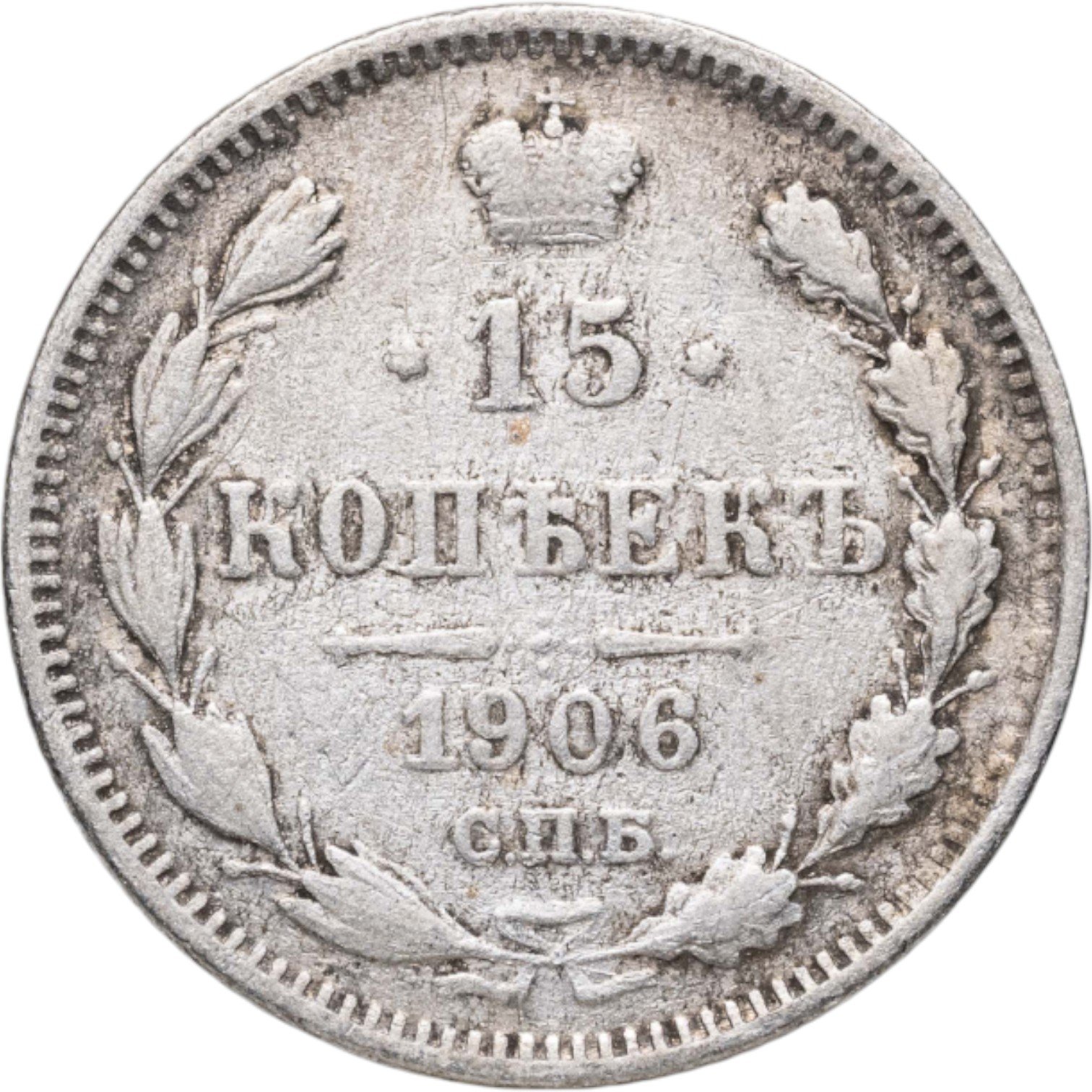 В центре указан номинал «15», ограниченный с обеих сторон звездочками. Над цифрой – Корона Российской империи. Под цифрой номинала — слово "КОПЕЕК". Ниже, расположен декоративный разделитель в виде двух разнонаправленных фигурных линий и стилизованным из точек крестом между ними. Под разделителем — дата выпуска монеты «1906». Под цифрой даты — обозначение монетного двора «С.П.Б.». Вдоль канта, не доходя до короны, изображен венок из лавровой и дубовой ветви, которые в нижней части перевязаны лентой на узел бантом. По окружности канта имеются рельефные элементы, выполненные в виде зубцов.