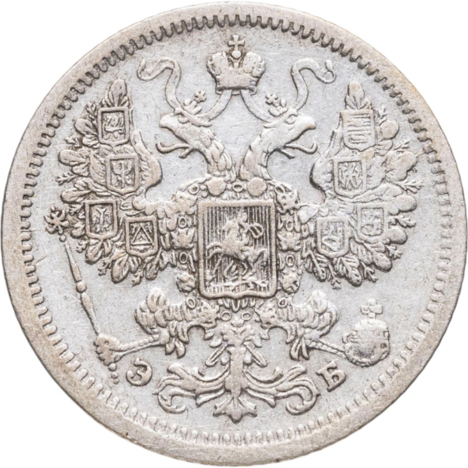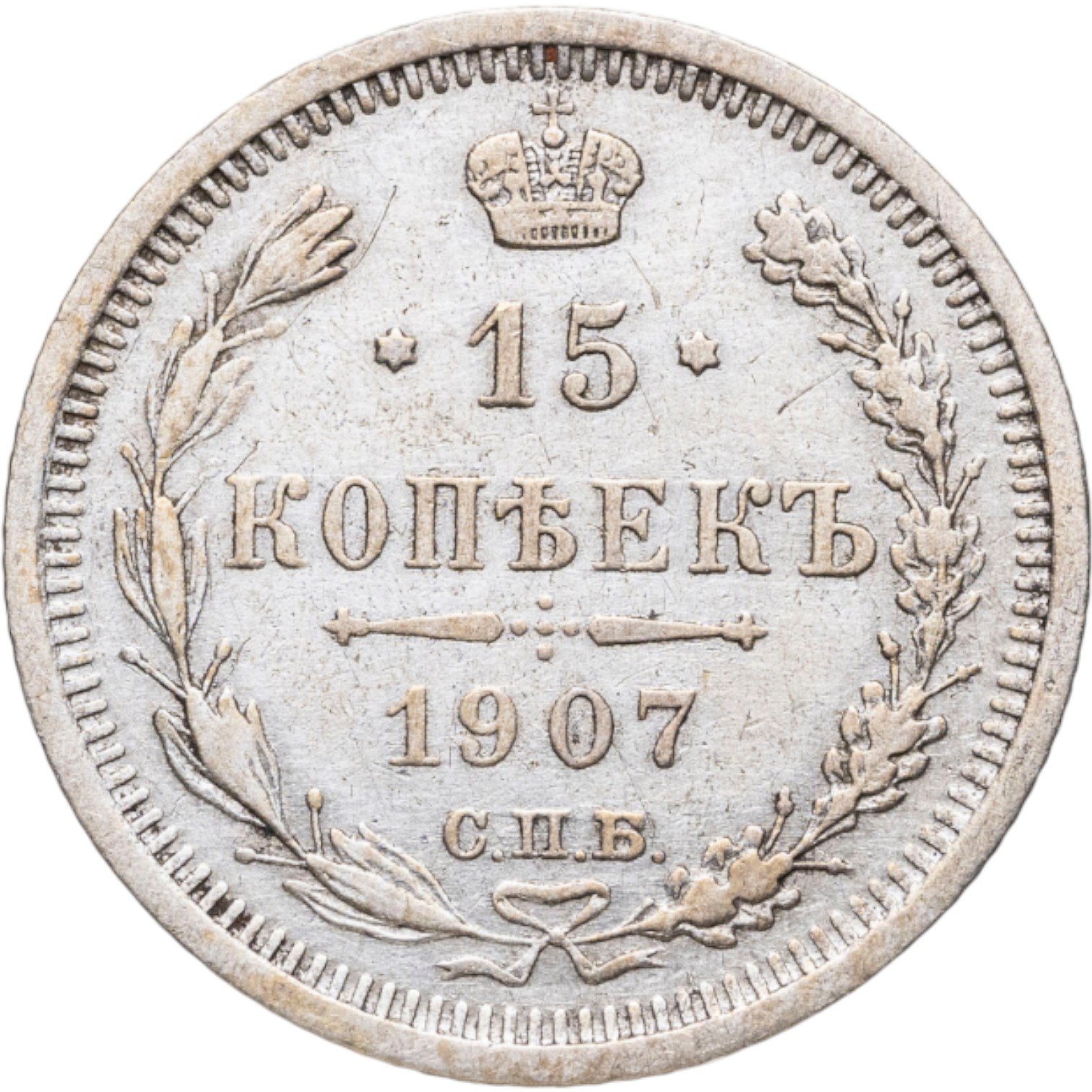В центре указан номинал «15», ограниченный с обеих сторон звездочками. Над цифрой – Корона Российской империи. Под цифрой номинала — слово "КОПЕЕК". Ниже, расположен декоративный разделитель в виде двух разнонаправленных фигурных линий и стилизованным из точек крестом между ними. Под разделителем — дата выпуска монеты «1907». Под цифрой даты — обозначение монетного двора «С.П.Б.». Вдоль канта, не доходя до короны, изображен венок из лавровой и дубовой ветви, которые в нижней части перевязаны лентой на узел бантом. По окружности канта имеются рельефные элементы, выполненные в виде зубцов.