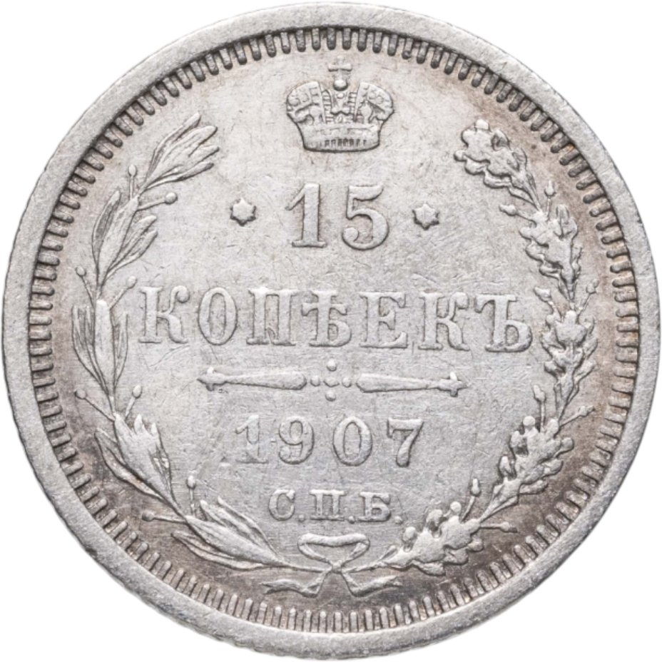 В центре указан номинал «15», ограниченный с обеих сторон звездочками. Над цифрой – Корона Российской империи. Под цифрой номинала — слово "КОПЕЕК". Ниже, расположен декоративный разделитель в виде двух разнонаправленных фигурных линий и стилизованным из точек крестом между ними. Под разделителем — дата выпуска монеты «1907». Под цифрой даты — обозначение монетного двора «С.П.Б.». Вдоль канта, не доходя до короны, изображен венок из лавровой и дубовой ветви, которые в нижней части перевязаны лентой на узел бантом. По окружности канта имеются рельефные элементы, выполненные в виде зубцов.