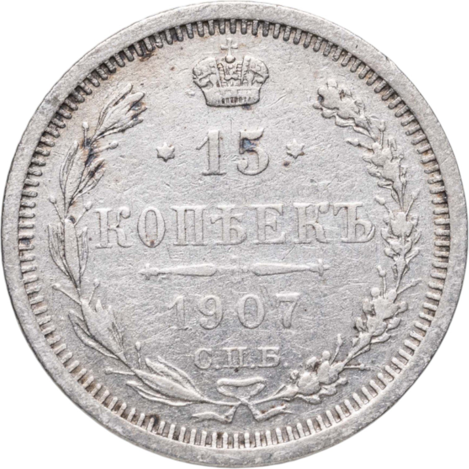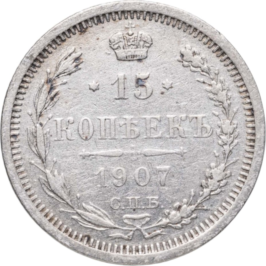 В центре указан номинал «15», ограниченный с обеих сторон звездочками. Над цифрой – Корона Российской империи. Под цифрой номинала — слово "КОПЕЕК". Ниже, расположен декоративный разделитель в виде двух разнонаправленных фигурных линий и стилизованным из точек крестом между ними. Под разделителем — дата выпуска монеты «1907». Под цифрой даты — обозначение монетного двора «С.П.Б.». Вдоль канта, не доходя до короны, изображен венок из лавровой и дубовой ветви, которые в нижней части перевязаны лентой на узел бантом. По окружности канта имеются рельефные элементы, выполненные в виде зубцов.