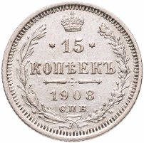 В центре указан номинал «15», ограниченный с обеих сторон звездочками. Над цифрой – Корона Российской империи. Под цифрой номинала — слово "КОПЕЕК". Ниже, расположен декоративный разделитель в виде двух разнонаправленных фигурных линий и стилизованным из точек крестом между ними. Под разделителем — дата выпуска монеты «1908». Под цифрой даты — обозначение монетного двора «С.П.Б.». Вдоль канта, не доходя до короны, изображен венок из лавровой и дубовой ветви, которые в нижней части перевязаны лентой на узел бантом. По окружности канта имеются рельефные элементы, выполненные в виде зубцов.