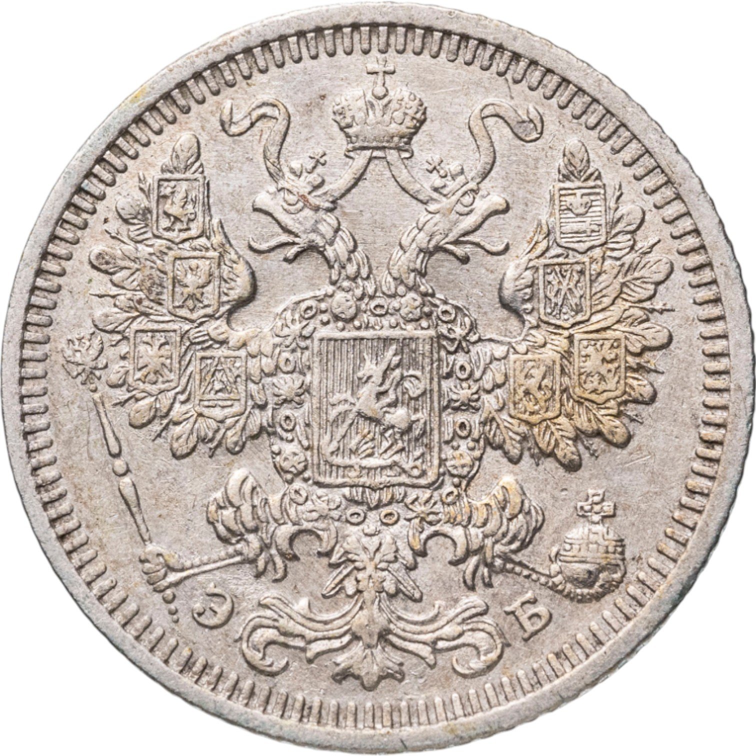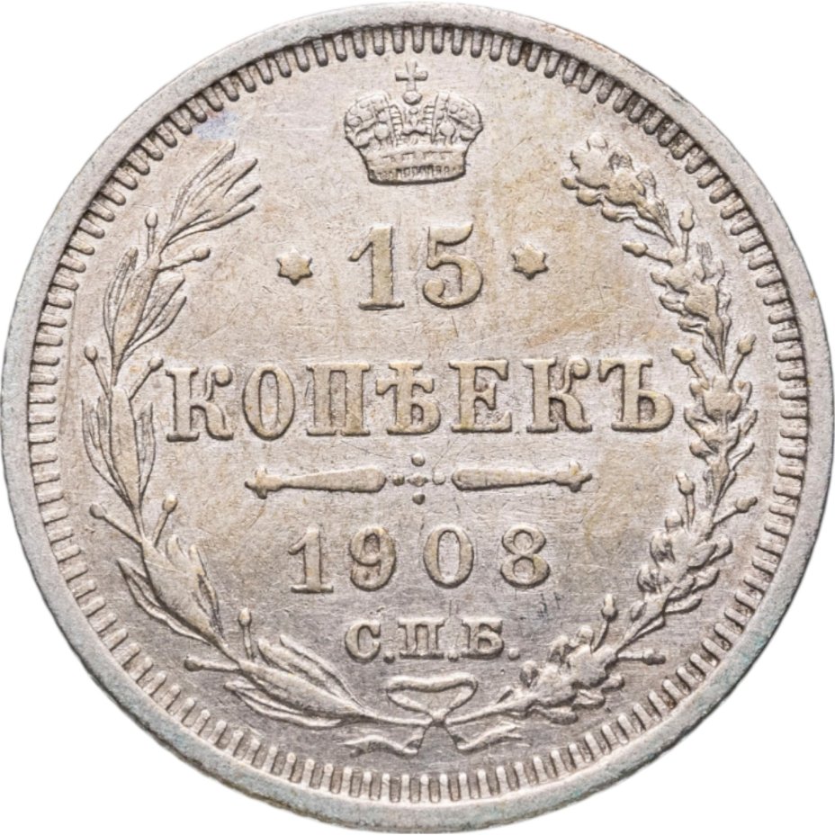 В центре указан номинал «15», ограниченный с обеих сторон звездочками. Над цифрой – Корона Российской империи. Под цифрой номинала — слово "КОПЕЕК". Ниже, расположен декоративный разделитель в виде двух разнонаправленных фигурных линий и стилизованным из точек крестом между ними. Под разделителем — дата выпуска монеты «1908». Под цифрой даты — обозначение монетного двора «С.П.Б.». Вдоль канта, не доходя до короны, изображен венок из лавровой и дубовой ветви, которые в нижней части перевязаны лентой на узел бантом. По окружности канта имеются рельефные элементы, выполненные в виде зубцов.