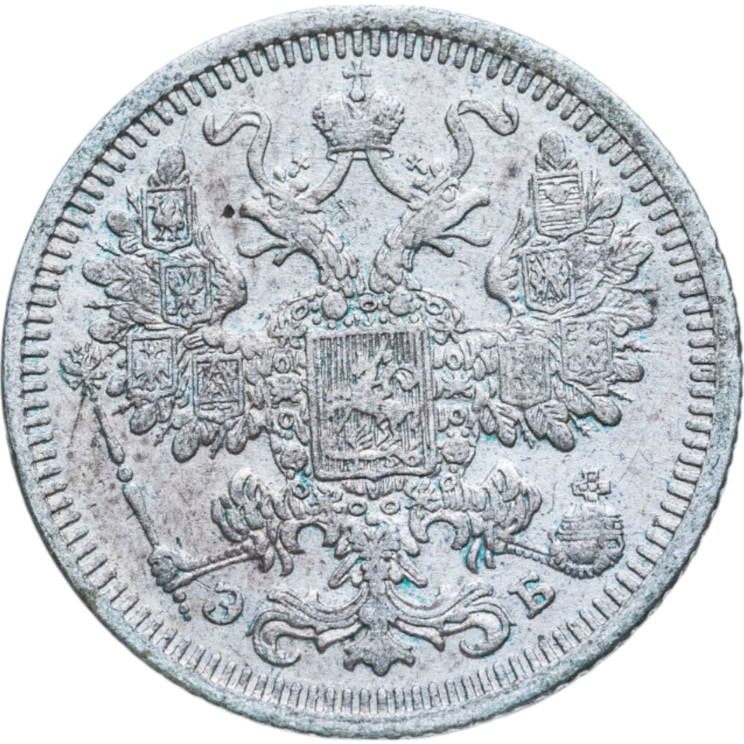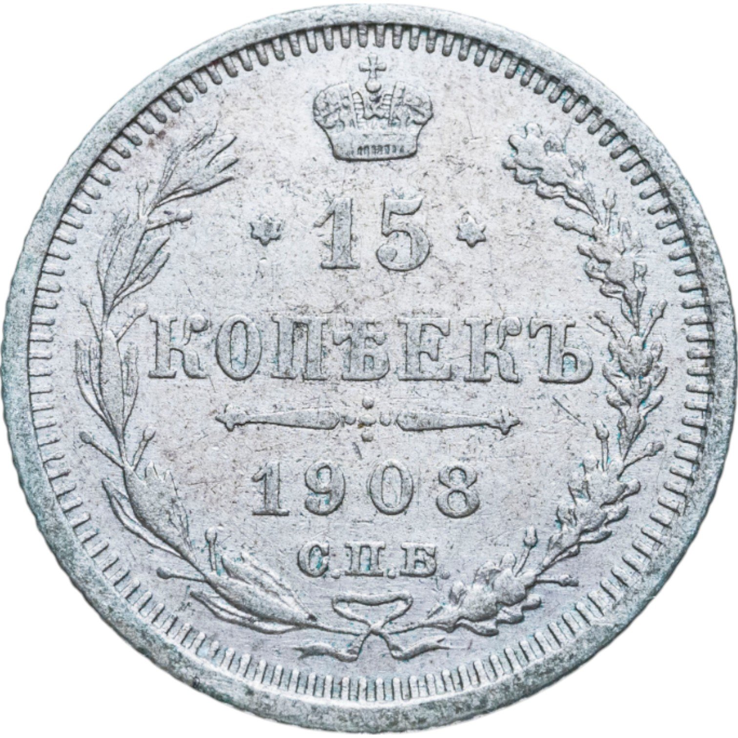 В центре указан номинал «15», ограниченный с обеих сторон звездочками. Над цифрой – Корона Российской империи. Под цифрой номинала — слово "КОПЕЕК". Ниже, расположен декоративный разделитель в виде двух разнонаправленных фигурных линий и стилизованным из точек крестом между ними. Под разделителем — дата выпуска монеты «1908». Под цифрой даты — обозначение монетного двора «С.П.Б.». Вдоль канта, не доходя до короны, изображен венок из лавровой и дубовой ветви, которые в нижней части перевязаны лентой на узел бантом. По окружности канта имеются рельефные элементы, выполненные в виде зубцов.