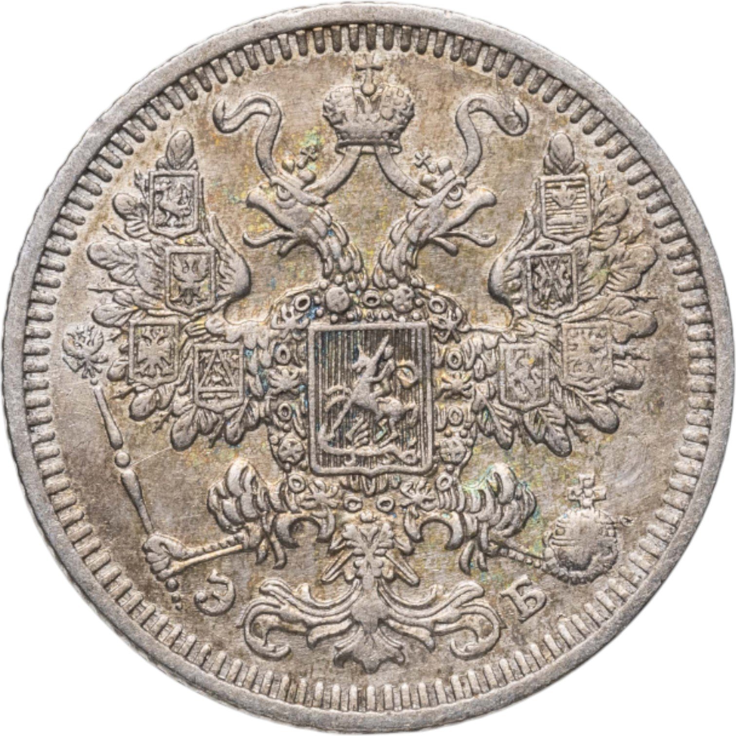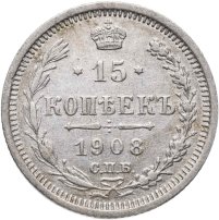 В центре указан номинал «15», ограниченный с обеих сторон звездочками. Над цифрой – Корона Российской империи. Под цифрой номинала — слово "КОПЕЕК". Ниже, расположен декоративный разделитель в виде двух разнонаправленных фигурных линий и стилизованным из точек крестом между ними. Под разделителем — дата выпуска монеты «1908». Под цифрой даты — обозначение монетного двора «С.П.Б.». Вдоль канта, не доходя до короны, изображен венок из лавровой и дубовой ветви, которые в нижней части перевязаны лентой на узел бантом. По окружности канта имеются рельефные элементы, выполненные в виде зубцов.
