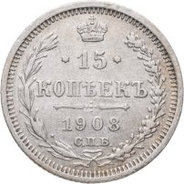 В центре указан номинал «15», ограниченный с обеих сторон звездочками. Над цифрой – Корона Российской империи. Под цифрой номинала — слово "КОПЕЕК". Ниже, расположен декоративный разделитель в виде двух разнонаправленных фигурных линий и стилизованным из точек крестом между ними. Под разделителем — дата выпуска монеты «1908». Под цифрой даты — обозначение монетного двора «С.П.Б.». Вдоль канта, не доходя до короны, изображен венок из лавровой и дубовой ветви, которые в нижней части перевязаны лентой на узел бантом. По окружности канта имеются рельефные элементы, выполненные в виде зубцов.