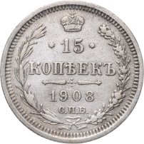 В центре указан номинал «15», ограниченный с обеих сторон звездочками. Над цифрой – Корона Российской империи. Под цифрой номинала — слово "КОПЕЕК". Ниже, расположен декоративный разделитель в виде двух разнонаправленных фигурных линий и стилизованным из точек крестом между ними. Под разделителем — дата выпуска монеты «1908». Под цифрой даты — обозначение монетного двора «С.П.Б.». Вдоль канта, не доходя до короны, изображен венок из лавровой и дубовой ветви, которые в нижней части перевязаны лентой на узел бантом. По окружности канта имеются рельефные элементы, выполненные в виде зубцов.