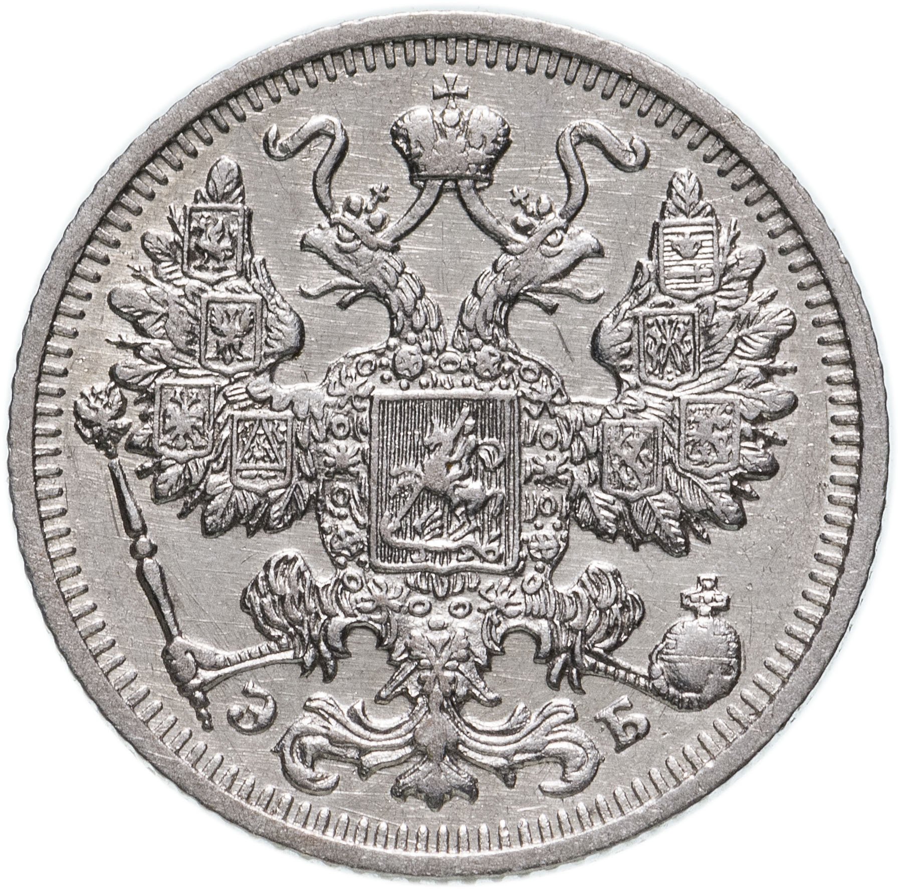 в центре изображен Малый Государственный Герб Российской империи - двуглавый орёл, головы которого увенчаны двумя коронами, третья, большая корона над ними. Все они соединены орденской лентой ордена Св. Апостола Андрея Первозванного. На груди орла расположен Московский герб, в щите изображен Георгий Победоносец с копьем поражающий дракона. Вокруг щита цепь ордена Св. Апостола Андрея Первозванного. На крыльях изображены гербы: Царства Казанского, Польского, Херсонеса Таврического, Астраханского, Сибирского, Грузинского и герб соединенных княжеств Киевского, Новгородского и Владимирского — по 4 на каждое крыло. В правой лапе орла – скипетр, в левой – держава. Под правой лапой – буква «Э», под левой – буква «Б». Инициалы минцмейстера Эликума Бабаянца. По окружности канта имеются рельефные элементы, выполненные в виде зубцов.