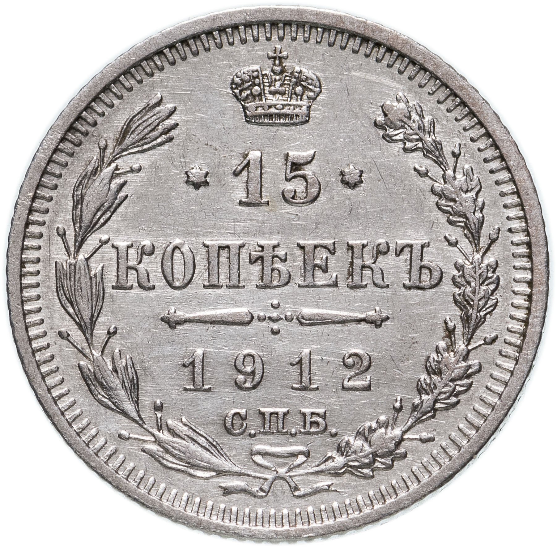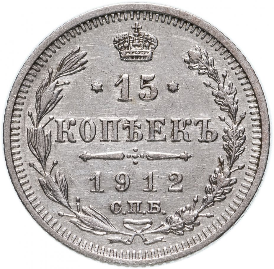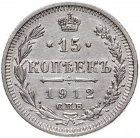 в центре указан номинал «15», ограниченный с обеих сторон звездочками. Над цифрой – Корона Российской империи. Под цифрой номинала — слово "КОПЕЕК". Ниже, расположен декоративный разделитель в виде двух разнонаправленных фигурных линий и стилизованным из точек крестом между ними. Под разделителем — дата выпуска монеты «1912». Под цифрой даты — обозначение монетного двора «С.П.Б.». Вдоль канта, не доходя до короны, изображен венок из лавровой и дубовой ветви, которые в нижней части перевязаны лентой на узел бантом. По окружности канта имеются рельефные элементы, выполненные в виде зубцов.