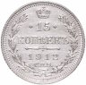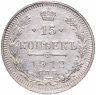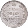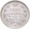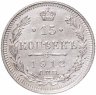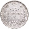 в центре указан номинал «15», ограниченный с обеих сторон звездочками. Над цифрой – Корона Российской империи. Под цифрой номинала — слово "КОПЕЕК". Ниже, расположен декоративный разделитель в виде двух разнонаправленных фигурных линий и стилизованным из точек крестом между ними. Под разделителем — дата выпуска монеты «1912». Под цифрой даты — обозначение монетного двора «С.П.Б.». Вдоль канта, не доходя до короны, изображен венок из лавровой и дубовой ветви, которые в нижней части перевязаны лентой на узел бантом. По окружности канта имеются рельефные элементы, выполненные в виде зубцов.