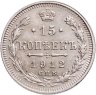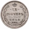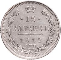 в центре указан номинал «15», ограниченный с обеих сторон звездочками. Над цифрой – Корона Российской империи. Под цифрой номинала — слово "КОПЕЕК". Ниже, расположен декоративный разделитель в виде двух разнонаправленных фигурных линий и стилизованным из точек крестом между ними. Под разделителем — дата выпуска монеты «1912». Под цифрой даты — обозначение монетного двора «С.П.Б.». Вдоль канта, не доходя до короны, изображен венок из лавровой и дубовой ветви, которые в нижней части перевязаны лентой на узел бантом. По окружности канта имеются рельефные элементы, выполненные в виде зубцов.