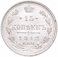 в центре указан номинал «15», ограниченный с обеих сторон звездочками. Над цифрой – Корона Российской империи. Под цифрой номинала — слово "КОПЕЕК". Ниже, расположен декоративный разделитель в виде двух разнонаправленных фигурных линий и стилизованным из точек крестом между ними. Под разделителем — дата выпуска монеты «1912». Под цифрой даты — обозначение монетного двора «С.П.Б.». Вдоль канта, не доходя до короны, изображен венок из лавровой и дубовой ветви, которые в нижней части перевязаны лентой на узел бантом. По окружности канта имеются рельефные элементы, выполненные в виде зубцов.