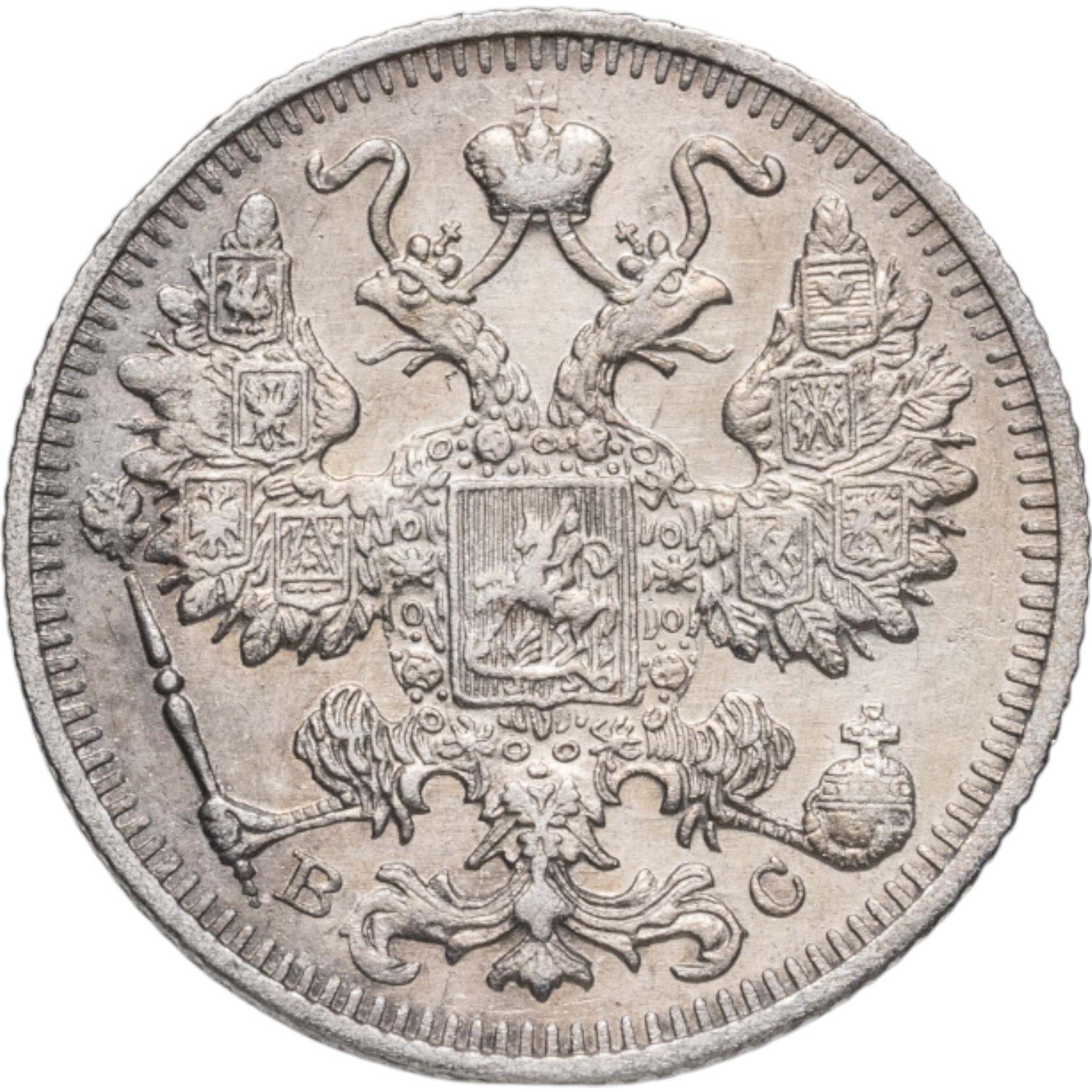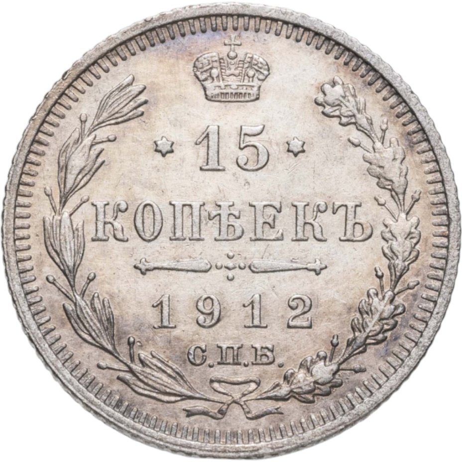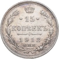 в центре указан номинал «15», ограниченный с обеих сторон звездочками. Над цифрой – Корона Российской империи. Под цифрой номинала — слово "КОПЕЕК". Ниже, расположен декоративный разделитель в виде двух разнонаправленных фигурных линий и стилизованным из точек крестом между ними. Под разделителем — дата выпуска монеты «1912». Под цифрой даты — обозначение монетного двора «С.П.Б.». Вдоль канта, не доходя до короны, изображен венок из лавровой и дубовой ветви, которые в нижней части перевязаны лентой на узел бантом. По окружности канта имеются рельефные элементы, выполненные в виде зубцов.