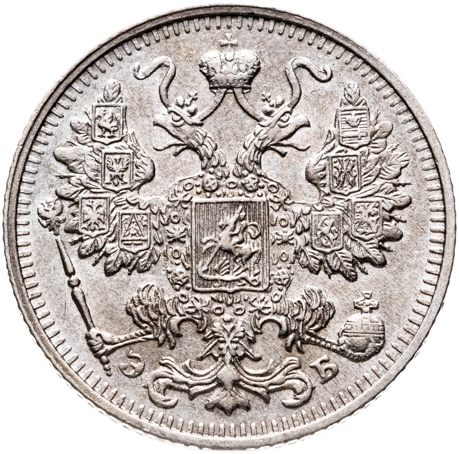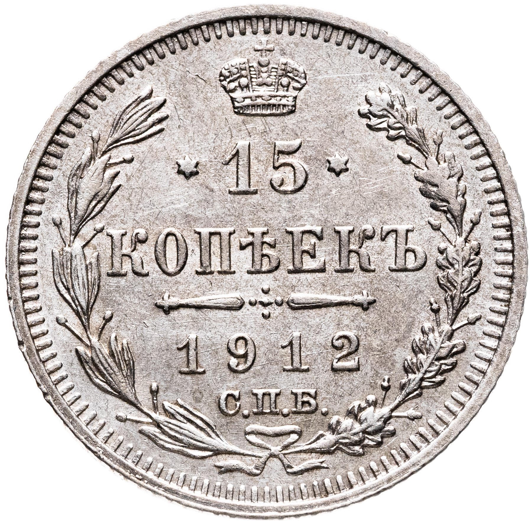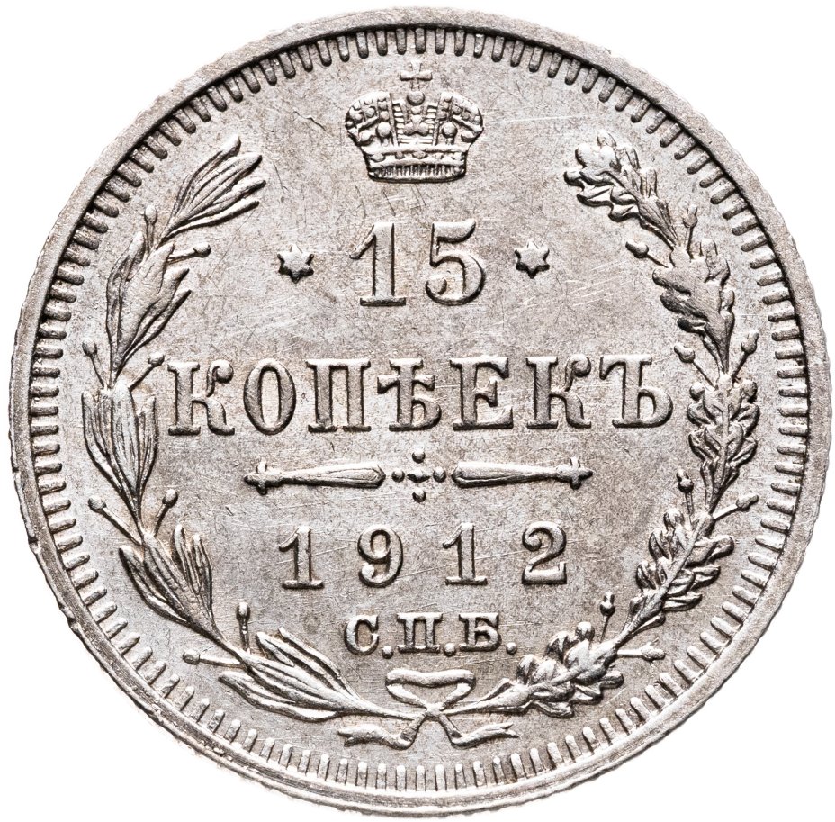 в центре указан номинал «15», ограниченный с обеих сторон звездочками. Над цифрой – Корона Российской империи. Под цифрой номинала — слово "КОПЕЕК". Ниже, расположен декоративный разделитель в виде двух разнонаправленных фигурных линий и стилизованным из точек крестом между ними. Под разделителем — дата выпуска монеты «1912». Под цифрой даты — обозначение монетного двора «С.П.Б.». Вдоль канта, не доходя до короны, изображен венок из лавровой и дубовой ветви, которые в нижней части перевязаны лентой на узел бантом. По окружности канта имеются рельефные элементы, выполненные в виде зубцов.