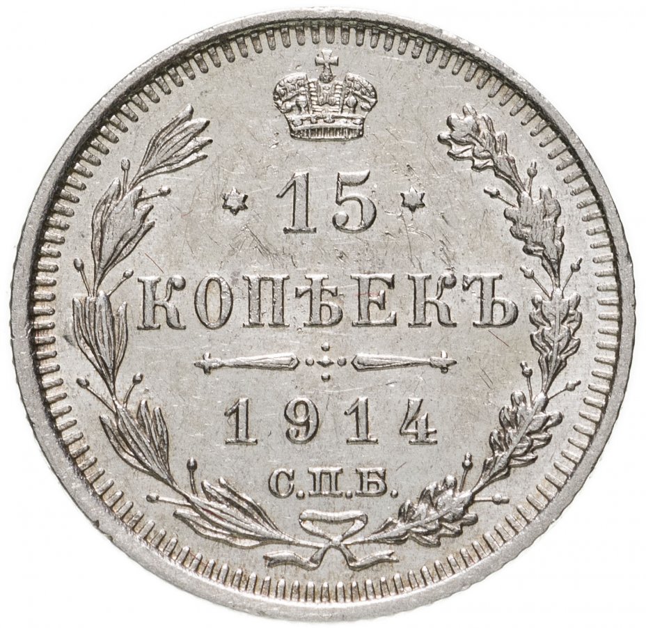В центре указан номинал «15», ограниченный с обеих сторон звездочками. Над цифрой – Корона Российской империи. Под цифрой номинала — слово "КОПЕЕК". Ниже, расположен декоративный разделитель в виде двух разнонаправленных фигурных линий и стилизованным из точек крестом между ними. Под разделителем — дата выпуска монеты «1914». Под цифрой даты — обозначение монетного двора «С.П.Б.». Вдоль канта, не доходя до короны, изображен венок из лавровой и дубовой ветви, которые в нижней части перевязаны лентой на узел бантом. По окружности канта имеются рельефные элементы, выполненные в виде зубцов.