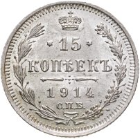 В центре указан номинал «15», ограниченный с обеих сторон звездочками. Над цифрой – Корона Российской империи. Под цифрой номинала — слово "КОПЕЕК". Ниже, расположен декоративный разделитель в виде двух разнонаправленных фигурных линий и стилизованным из точек крестом между ними. Под разделителем — дата выпуска монеты «1914». Под цифрой даты — обозначение монетного двора «С.П.Б.». Вдоль канта, не доходя до короны, изображен венок из лавровой и дубовой ветви, которые в нижней части перевязаны лентой на узел бантом. По окружности канта имеются рельефные элементы, выполненные в виде зубцов.