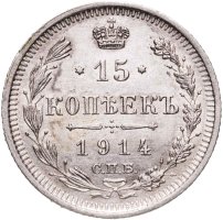 В центре указан номинал «15», ограниченный с обеих сторон звездочками. Над цифрой – Корона Российской империи. Под цифрой номинала — слово "КОПЕЕК". Ниже, расположен декоративный разделитель в виде двух разнонаправленных фигурных линий и стилизованным из точек крестом между ними. Под разделителем — дата выпуска монеты «1914». Под цифрой даты — обозначение монетного двора «С.П.Б.». Вдоль канта, не доходя до короны, изображен венок из лавровой и дубовой ветви, которые в нижней части перевязаны лентой на узел бантом. По окружности канта имеются рельефные элементы, выполненные в виде зубцов.