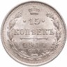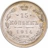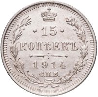 В центре указан номинал «15», ограниченный с обеих сторон звездочками. Над цифрой – Корона Российской империи. Под цифрой номинала — слово "КОПЕЕК". Ниже, расположен декоративный разделитель в виде двух разнонаправленных фигурных линий и стилизованным из точек крестом между ними. Под разделителем — дата выпуска монеты «1914». Под цифрой даты — обозначение монетного двора «С.П.Б.». Вдоль канта, не доходя до короны, изображен венок из лавровой и дубовой ветви, которые в нижней части перевязаны лентой на узел бантом. По окружности канта имеются рельефные элементы, выполненные в виде зубцов.