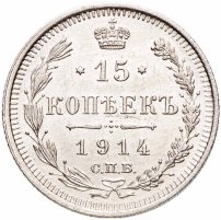 В центре указан номинал «15», ограниченный с обеих сторон звездочками. Над цифрой – Корона Российской империи. Под цифрой номинала — слово "КОПЕЕК". Ниже, расположен декоративный разделитель в виде двух разнонаправленных фигурных линий и стилизованным из точек крестом между ними. Под разделителем — дата выпуска монеты «1914». Под цифрой даты — обозначение монетного двора «С.П.Б.». Вдоль канта, не доходя до короны, изображен венок из лавровой и дубовой ветви, которые в нижней части перевязаны лентой на узел бантом. По окружности канта имеются рельефные элементы, выполненные в виде зубцов.