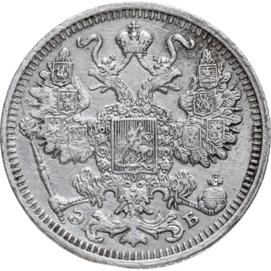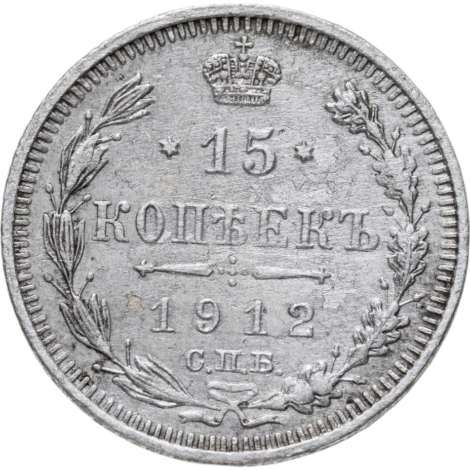 В центре указан номинал «15», ограниченный с обеих сторон звездочками. Над цифрой – Корона Российской империи. Под цифрой номинала — слово "КОПЕЕК". Ниже, расположен декоративный разделитель в виде двух разнонаправленных фигурных линий и стилизованным из точек крестом между ними. Под разделителем — дата выпуска монеты «1914». Под цифрой даты — обозначение монетного двора «С.П.Б.». Вдоль канта, не доходя до короны, изображен венок из лавровой и дубовой ветви, которые в нижней части перевязаны лентой на узел бантом. По окружности канта имеются рельефные элементы, выполненные в виде зубцов.