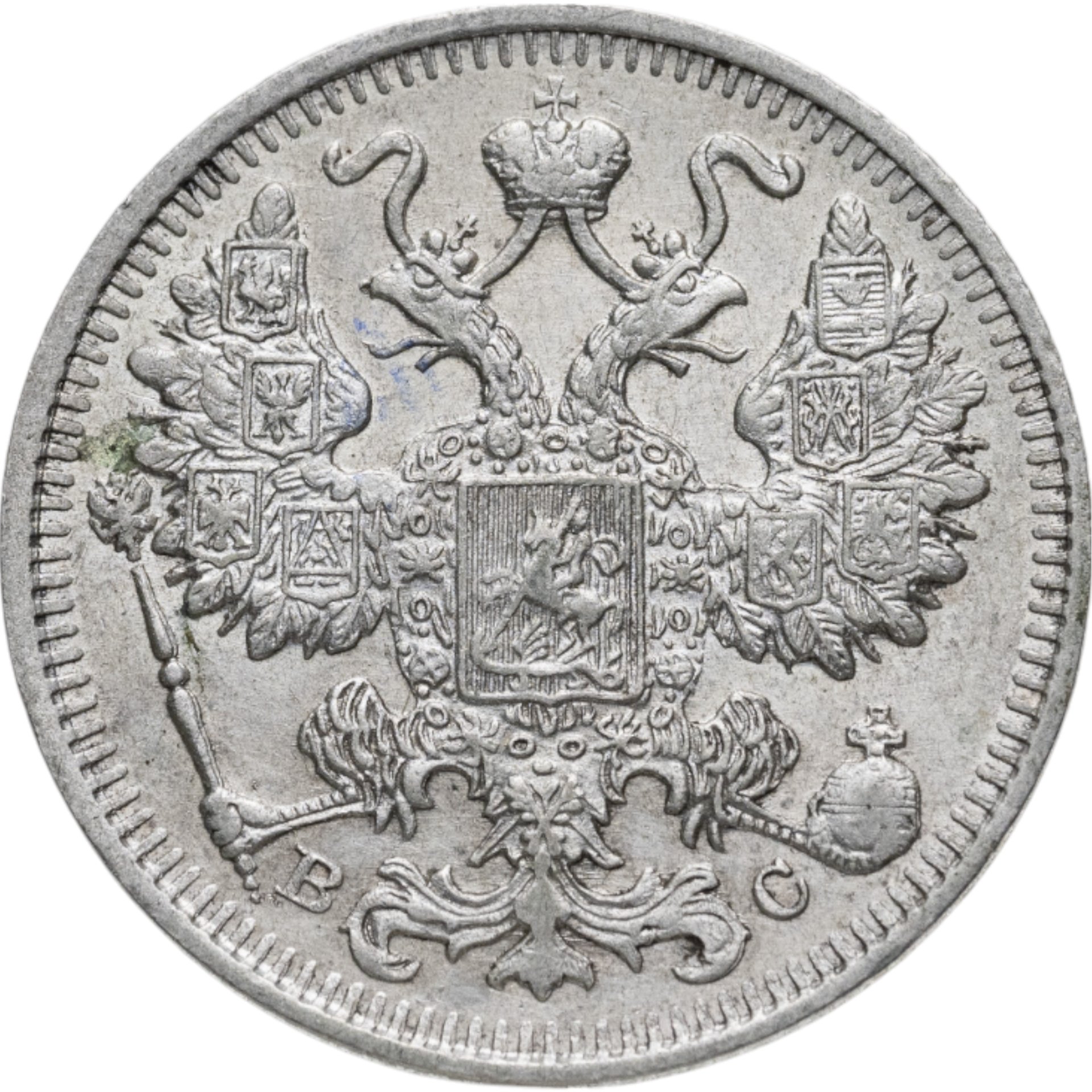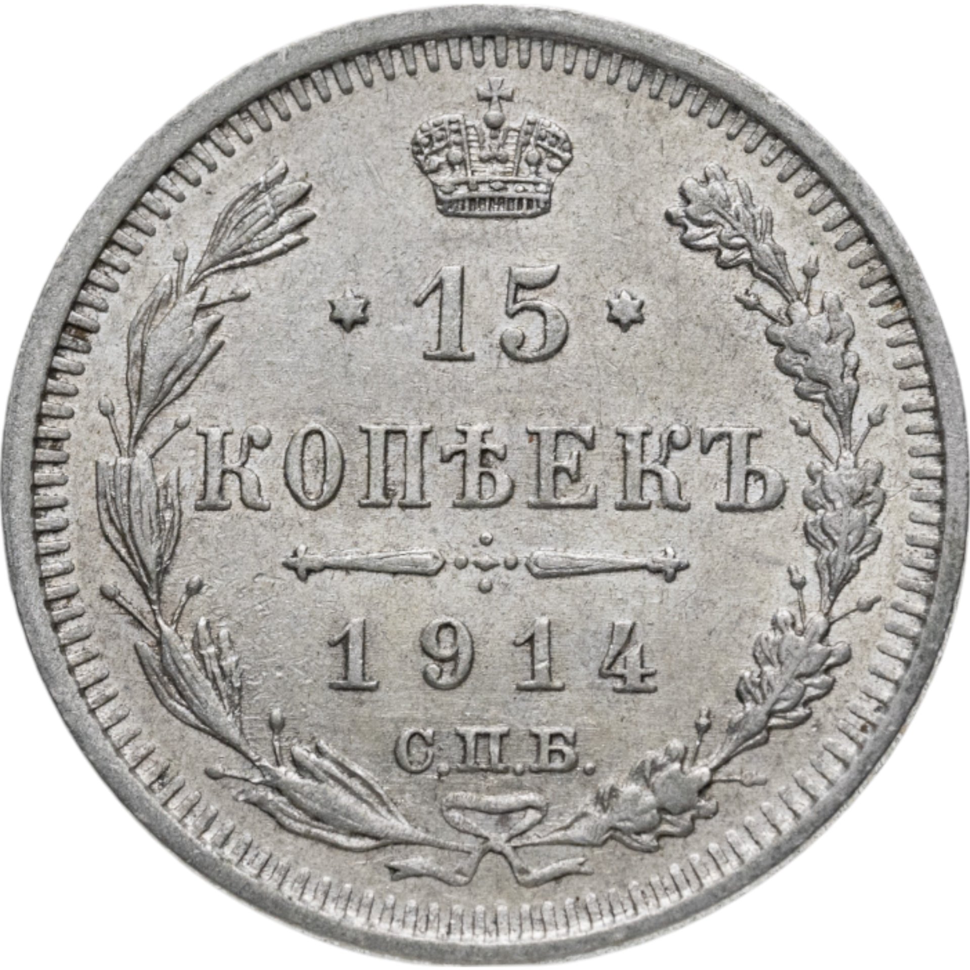 В центре указан номинал «15», ограниченный с обеих сторон звездочками. Над цифрой – Корона Российской империи. Под цифрой номинала — слово "КОПЕЕК". Ниже, расположен декоративный разделитель в виде двух разнонаправленных фигурных линий и стилизованным из точек крестом между ними. Под разделителем — дата выпуска монеты «1914». Под цифрой даты — обозначение монетного двора «С.П.Б.». Вдоль канта, не доходя до короны, изображен венок из лавровой и дубовой ветви, которые в нижней части перевязаны лентой на узел бантом. По окружности канта имеются рельефные элементы, выполненные в виде зубцов.