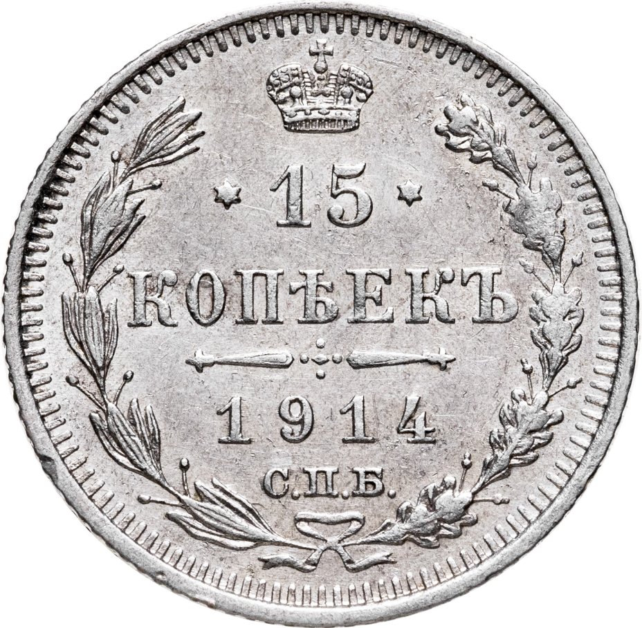 В центре указан номинал «15», ограниченный с обеих сторон звездочками. Над цифрой – Корона Российской империи. Под цифрой номинала — слово "КОПЕЕК". Ниже, расположен декоративный разделитель в виде двух разнонаправленных фигурных линий и стилизованным из точек крестом между ними. Под разделителем — дата выпуска монеты «1914». Под цифрой даты — обозначение монетного двора «С.П.Б.». Вдоль канта, не доходя до короны, изображен венок из лавровой и дубовой ветви, которые в нижней части перевязаны лентой на узел бантом. По окружности канта имеются рельефные элементы, выполненные в виде зубцов.