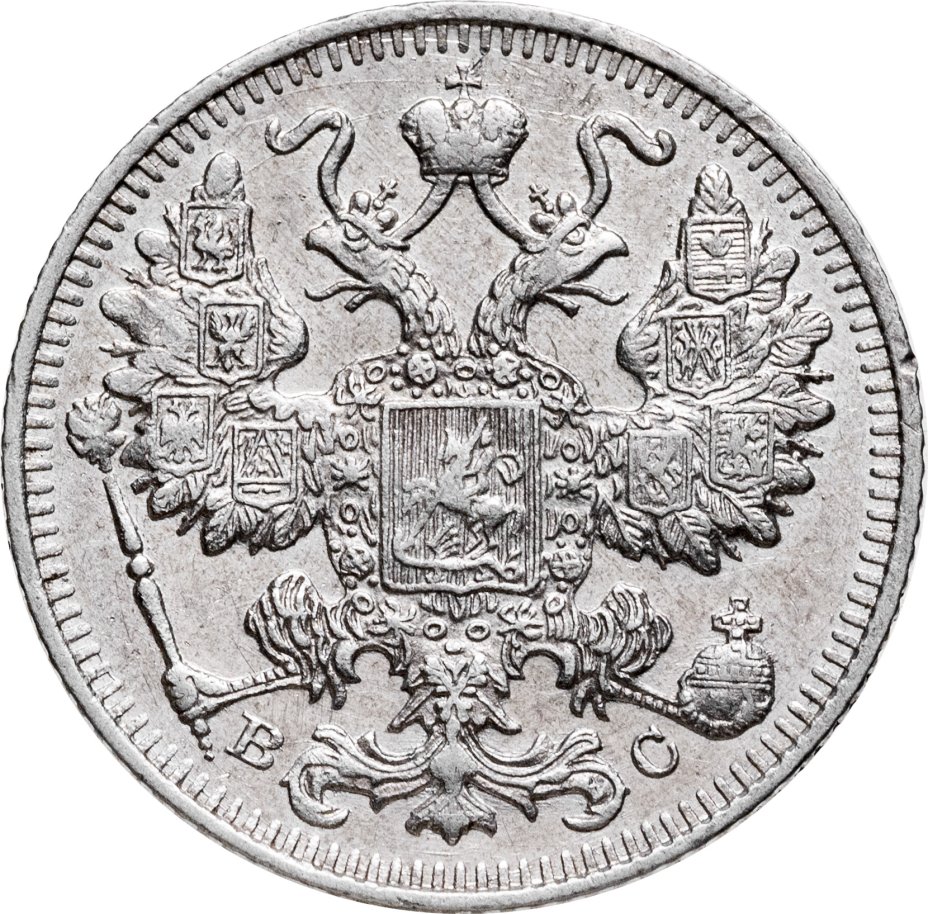 В центре изображен Малый Государственный Герб Российской империи - двуглавый орёл, головы которого увенчаны двумя коронами, третья, большая корона над ними. Все они соединены орденской лентой ордена Св. Апостола Андрея Первозванного. На груди орла расположен Московский герб, в щите изображен Георгий Победоносец с копьем поражающий дракона. Вокруг щита цепь ордена Св. Апостола Андрея Первозванного. На крыльях изображены гербы: Царства Казанского, Польского, Херсонеса Таврического, Астраханского, Сибирского, Грузинского и герб соединенных княжеств Киевского, Новгородского и Владимирского — по 4 на каждое крыло. В правой лапе орла – скипетр, в левой – держава. Под правой лапой – буква «В», под левой – буква «С». Инициалы минцмейстера Виктора Смирнова. По окружности канта имеются рельефные элементы, выполненные в виде зубцов.